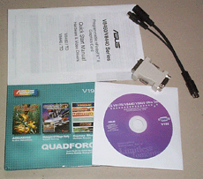 Und auch bei der V8440 TD kann man mit Asus zufrieden sein. Der Verpackung der Grafikkarte liegt ein kleines "Heftchen", mehrere CD-ROMs, 1 Kabel und 1 Adapter bei. Bei dem Heftchen handelt es sich um das Handbuch, welches zwar auf den ersten Blick etwas mager aussieht (15 Seiten), doch das wesentliche genaustens und gut bebildert erklärt. Leider ist die Anleitung nur auf Englisch (Auch auf der Asus Deutschland WebSite nur auf Englisch erhältlich). Mit Datenträgern war Asus auch sehr großzügig: Neben einer Installations-CD mit neusten Treibern, findet man noch drei weitere CDs, welche die Vollversionen von AquaNox, MidNight GT und diverse Demos enthalten. Enttäuschend ist leider der Asus-DVD Player, welcher zwar auf der Verpackung als Inhalt erwähnt wird, jedoch nicht enthalten war. Ob es sich hier um eine Ausnahme, also um einen Verpackungsfehler, oder um einen falschen Aufdruck handelt, können wir leider nicht beantworten...