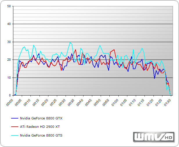 Ein wichtiger Punkt in unserem Benchmarkparcour ist auch die HDTV-Wiedergabe. So testeten wir, ob bzw. wie gut unsere Kandidaten WMV-Videos in HDTV-Qualität beschleunigen können. Aus dem folgendem Diagramm lässt sich allerdings deutlich erkennen, dass beide Kontrahenten - namentlich Nvidia und ATi - ihre Hausaufgaben ordentlich erledigt haben. Für die Wiedergabe im Windows Media Player 11 nutzten wir ein WMV-HD-Video von Microsoft (Journey Into Amazing Caves) mit einer Spieldauer von 1:25 Minuten.