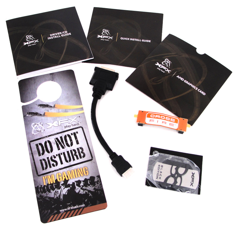 Zum Inhalt der Radeon HD 7950-Verpackung gehören die obligatorische Software- und Treiber-CD, ein XFX Black-Edition-Case-Badge, ein Quick Installation Guide sowie diverses Werbematerial. Außerdem legt XFX der Karte einen HDMI-DVI-Adapter und eine CrossFire-Bridge, von der wir auf den folgenden Seite noch Gebrauch machen werden, bei. Ein nettes Schild "Do Not Disturbe, I'm Gaming" für die heimische Türklinke schützt vor unerwarteten Gästen. Auf weitere Anschlusskabel, wie beispielsweise PCIe-Molex-Adapter, verzichtet man vollständig. Folgend der gesamte Lieferumfang im Überblick: