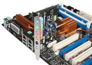 Mit zum oberen Mainboardteil gehört auch das Back-Panel, das eigentlich alle auf dem Board verfügbaren Anschlüsse nach Außen schleift. So finden wir folgende Schnittstellen: PS2 für Tastatur und Maus, Digital-Audio via Chinch und optischem Leiter, FireWire 400, 2x RJ45 Gigabit-Ethernet, sowie 4x USB 2.0. Für die übrigen FireWire- und USB-Ports liegen Slotbrackets bei bzw. können an das Front-Panel angeschlossen werden. Ob man den wegrationalisierten COM-Port als Nachteil ansehen kann, bleibt fraglich. Für den Hardcore-Gamer, den das Board zweifellos adressiert, sollte es dadurch keine Probleme geben.