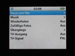 Der nächste Menüpunkt, Fotos, bietet ebenfalls detaillierte Einstellungsmöglichkeiten. So kann man nicht nur manuell durch die vorhandenen Fotos navigieren, sondern auch eine praktische Diashow erstellen. Hierzu kann man nicht nur die Dauer der Wiedergabe jedes Bildes einstellen, sondern auch verschiedene Übergänge zwischen den Dias wählen und das Ganze mit einer gewünschten Musik (alle auf dem iPod befindlichen Titel stehen zur Auswahl) untermalen. Besitzt man die Universal Dock Docking-Station, kann man die Diashow zudem über S-Video bzw. den AV-Ausgang am heimischen TV-Gerät wiedergeben - mit Hilfe der Apple Remote Fernbedienung kann man anschließend auch die Wiedergabe beeinflussen. Auch die Video-Funktion des iPod bietet die Möglichkeit der Ausgabe über externe Geräte. Neben der herkömmlichen Sortierung nach dem Typ der Multimediafiles (Film, Musikvideo, Podcast), gibt es auch hier die Auswahl von vorgefertigten Playlisten. Leider bietet Apple hier kein "On-The-Go" an, weshalb man Wiedergabelisten nur zuvor mit Hilfe von iTunes erstellen und anschließend auf dem iPod benutzen kann - hier könnte man mit einer neuen Firmware vielleicht noch nachbessern. Ansonsten sind wir mit der gesamten Menüführung und dem Umfang der Einstellungsmöglichkeiten sehr zufrieden!