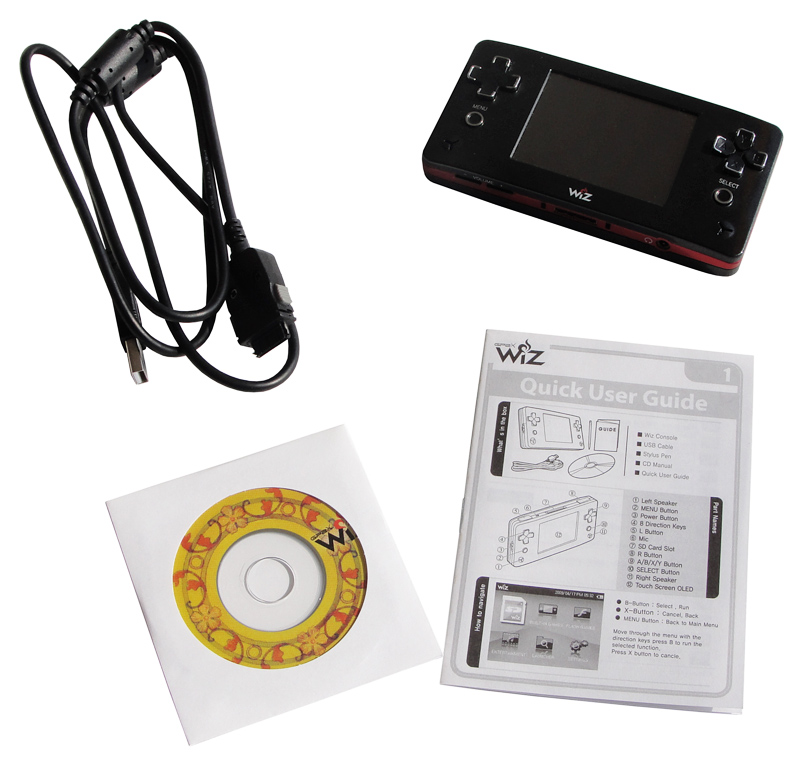 Der WIZ kommt nur mit einem spartanischen Lieferumfang daher. In seiner Packung befindet sich nebem dem WIZ selbst ein USB-Daten/Ladekabel, eine Kurzanleitung sowie eine miniCD mit weiterem Info-Material. Die Palette des optionalen Zubehörs fällt dahingegen ziemlich groß aus. Hier finden sich unter anderem: Ledertragetasche, USB-Netzteiladapter, diverse Speicherkarten und Ersatzakkus sowie Schuzfolien und Verzierungsaufkleber für die Oberfläche des WIZ. Weitere Infos dazu findet man direkt im deutschen GP2X-Shop. Der Lieferumfang im Überblick: