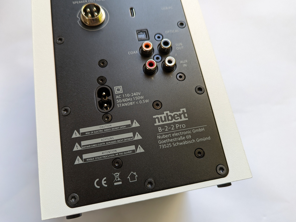 Die Boxen lassen sich über eine Vielzahl an Anschlüssen betreiben: Cinch, digital koaxial, digital optisch, USB und Bluetooth. Hier sind aptX, AAC, aptX HD und aptX Low Latency möglich. Die maximalen Samplingraten sind mit 24 Bit / 192 kHz (USB) und 24 Bit / 96 kHz (koaxial/optisch) angegeben. Zudem findet sich auf der Rückseite noch ein Subwoofer-Ausgang.