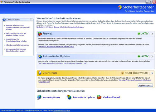 Horch was kommt von draußen rein, wird doch wohl kein Fremder sein… – und wenn doch kommt jetzt die integrierte Firewall bzw. der Virusscanner vom Sicherheitscenter zum Einsatz. Das Sicherheitscenter stellt das zentrale Programm dar, indem alle neuen Sicherheitsfeatures gesteuert werden können. Hier können selbst relativ unerfahrene Benutzer einfach ihren Computer vor Eindringlingen schützen. Nach der Service Pack 2 Installation startet das Sicherheitscenter gleich nach dem Neustart und so lässt es sich schnell und einfach konfigurieren. Im normalen Betrieb läuft es "lautlos" im Hintergrund und kann für Schaulustige auf Wunsch auch Alarmmeldungen anzeigen. Weiterhin ist für den interessierten User möglich Sicherheits- und Vireninformationen von Microsoft zu ordern oder Unterstützung bei Sicherheitsproblemen zu erhalten. Die automatische Update Funktion hält das System zudem auf dem neusten (Microsoft-) Sicherheitsstand mit Hilfe von Windows Update Version 5. Auch bei Virenprogrammen, welche von anderen Herstellern stammen, wird durch eine API Schnittstelle geprüft, wie alt beispielsweise die Virendefinitionen sind. Für den Laien ist es also sehr einfach durch das Sicherheitscenter geworden, seinen PC zu schützen und einen Überblick über den Schutz zu erhalten. Für den Profi ist es vorteilhaft, dass sich im "Falle des Falles" alles schnell deaktivieren lässt. ;-)