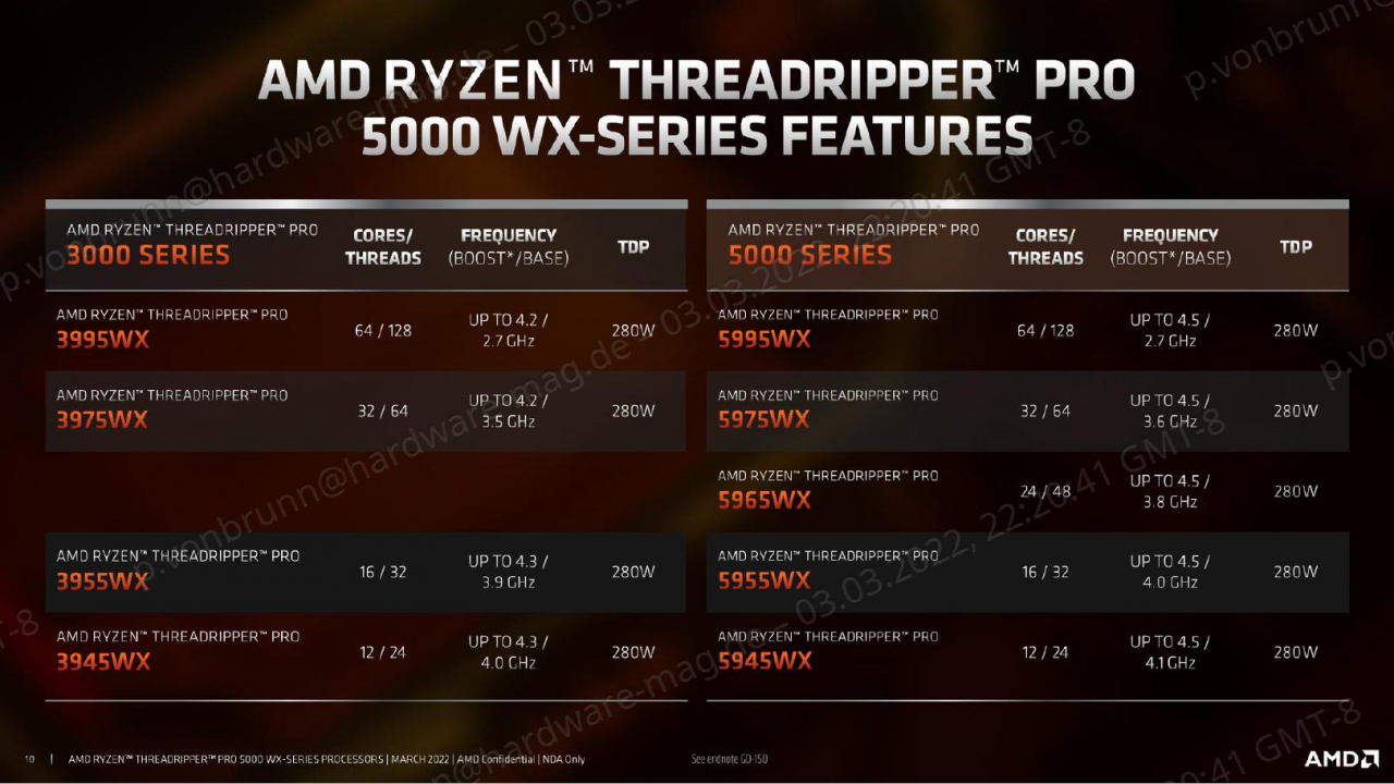 Zum heutigen Launch der neuen Workstation-Prozessoren umfasst die Familie fünf unterschiedliche Modelle, die gleich mehrere Gemeinsamkeiten mitbringen: Bis zu 4,5 GHz Boost-Frequenz, 280 Watt TDP, 8-Kanal Speichercontroller sowie 128 PCIe Gen4 Lanes für die Gesamtplattform. Die bisherigen Modelle der 3000er-Familie sind aktuell zu Straßenpreisen ab ca. 1.250 Euro bis hin zu 5.400 Euro für das Flaggschiff erhältlich. Diese Preise sind auch für die Zen 3-basierten Ryzen Threadripper PRO 5000WX zu erwarten.